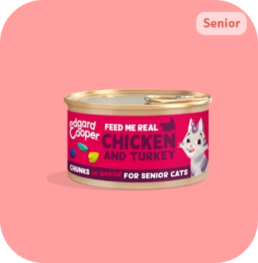 As latinhas de Chuncks de Frango e Peru do Campo Sénior Edgard & Cooper são uma alimentação húmida completa em pedacinhos de carne num molho irresistível especial para gatos com +7.