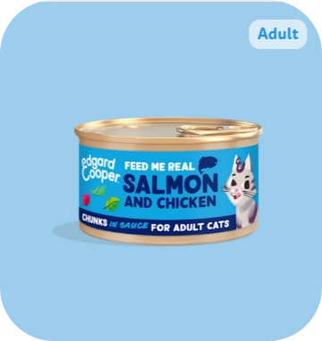 As latinhas de Chuncks de Salmão e frango Edgard & Cooper são uma alimentação húmida completa em pedacinhos de peixee carne num molho irresistível.