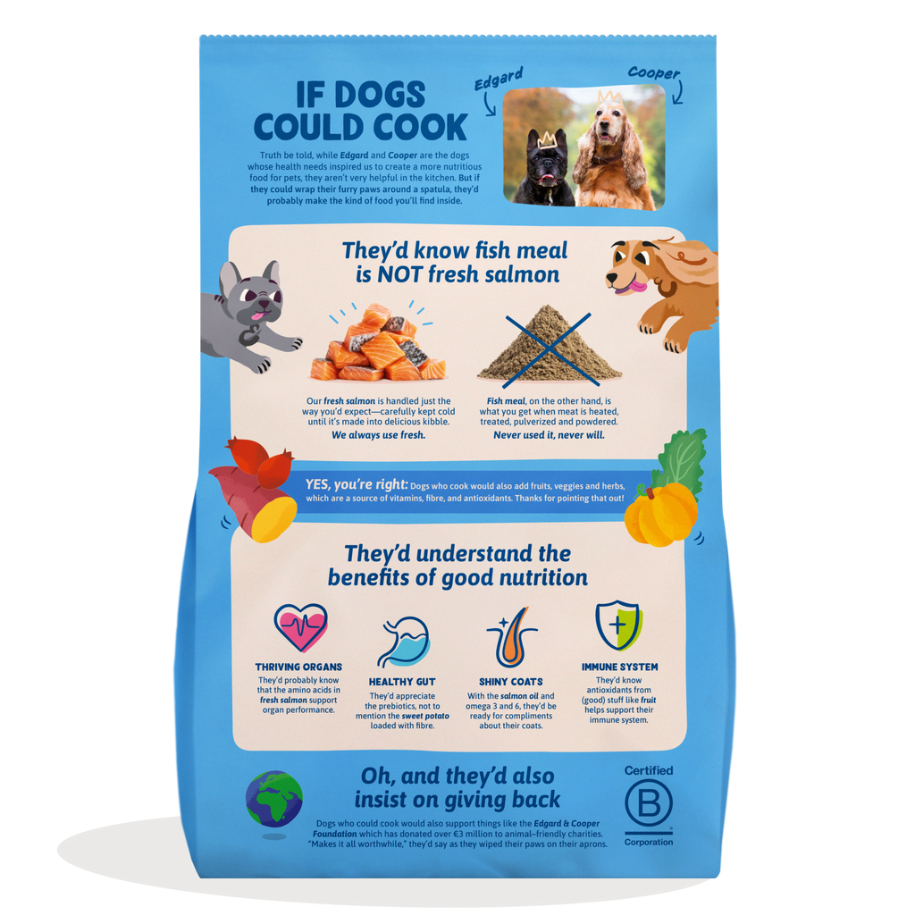 Ingredientes: salmão da noruega 100% fresco 40%, batata doce 13%, batata, proteína ervilha, ervilha, proteína batata, molho vegetal, linhaça 2%, polpa beterraba, minerais, leveduras 1,3%, polpa tomate, chicória 0,5%, abóbora 0,2%, couve-kale 0,2%, óleo de salmão 0,1%, mirtilos 0,05%, maçã 0,05%, salsa 0,02%, rosa mosqueta 0,02%, glucosamina 0,02%, condroitina 0,02%