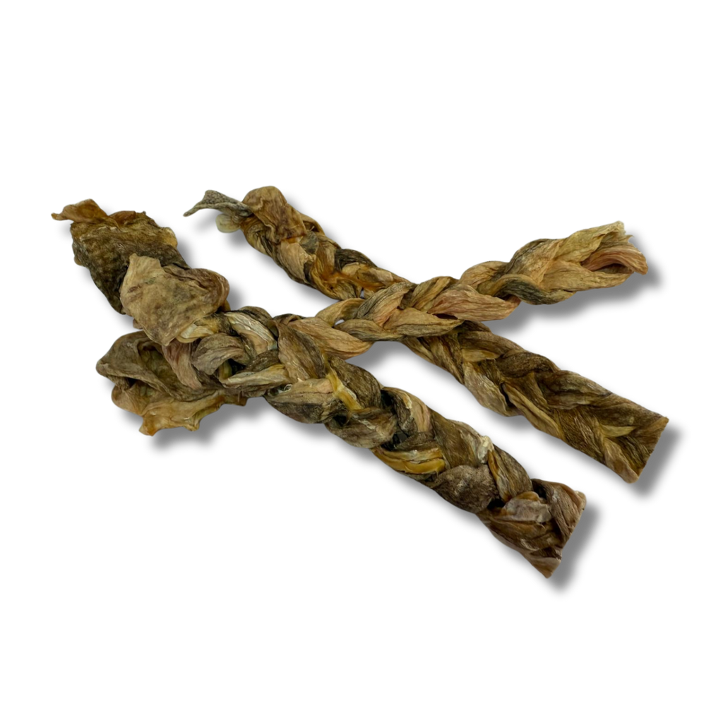 Snacks proteicos de 100% Rosada do Mar em forma de trança para efeito dental e desafio e mastigação adicional! É um snack de mastigação prolongada o que favorece a higiene oral e fortalece os dentes e gengivas. Para além disso, têm pouca gordura, bons para cães seniores e controlo do peso.