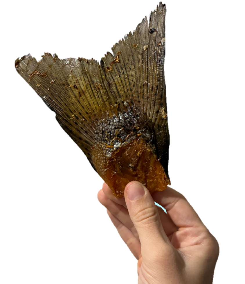 Snack crocante de Cauda de Salmão com carne de salmão extremamente rico em proteína, cálcio e fósforo bom para os dentes e estrutura óssea forte. Fonte natural de Ómega 3, para a saúde do pelo e coração.