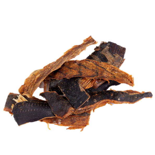 Tiras crocantes de pele de 100% atum do Atlântico muito nutritiva, extremamente ricas nos importantes ácidos gordos ómega 3 e 6, vitaminas, especialmente a vitamina D e Cálcio, de peixe pescado na costa do Atlântico / UE de qualidade de consumo humano.