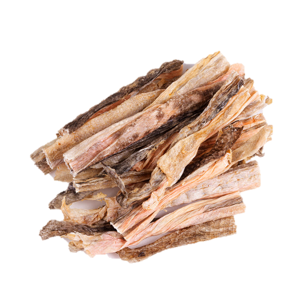 Tiras de pele CROCANTE de 100% Congro Rosa (ou Rosada), rico nos importantes ácidos gordos ómega 3 e 6 e Cálcio, de peixe pescado na costa do Atlântico de qualidade de consumo humano.