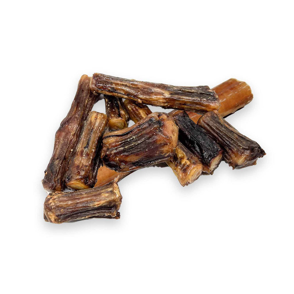 Pedacinhos crocantes altamente nutritivos de bovino proveniente de ossos carnudos da cauda de boi, extremamente ricos em colagénio e condroitina, bom para a pele e articulações. Alto teor de vitaminas e minerais.